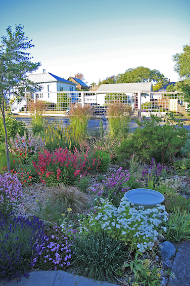 Pollinators are encouraged to visit the variety of flowering plants. Birds find the dense garden a haven for shelter and food, especially in the winter months. The garden doesn’t get cleaned up until warm weather in the spring to allow insects to overwinter.