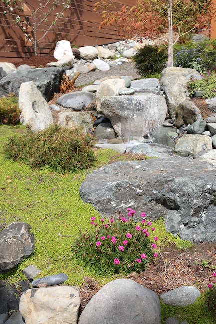 (Left) This garden features two lovely waterfalls. (Above) This property is replete with a magnificent blend of natural and artistic elements.
